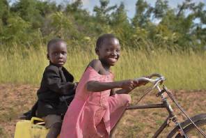 Two Ugandan children ride their bike to the well to fetch water.  (Photo by Rod Waddington) Photo used under CC BY